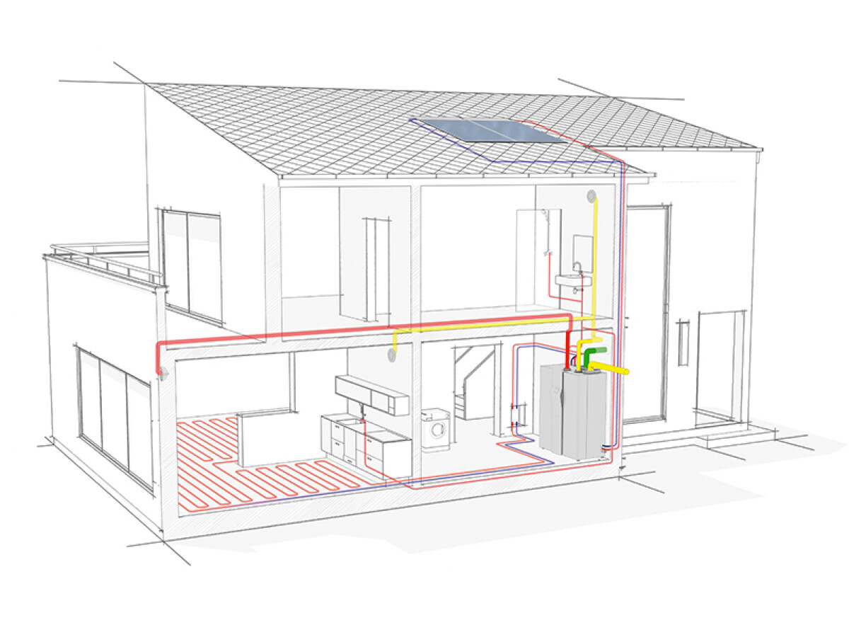 Nella parte più alta dell’aggregato trova spazio il sistema di ventilazione meccanica controllata in grado di gestire portate fino a 300 mc/h e recuperare fino al 90% del calore contenuto nell’aria di espulsione; in questo modo vengono contemporaneamente garantite aria salubre e un’elevata efficienza energetica all’abitazione.