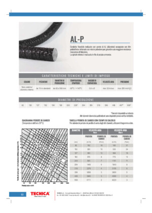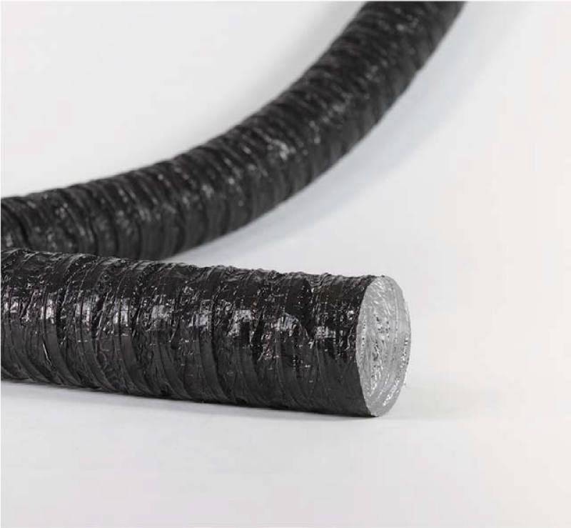 Condotto flessibile realizzato con parete AL (alluminio) accoppiato con film poliolefinico rinforzato con rete di poliestere per garantire una maggiore resistenza meccanica all'alluminio.