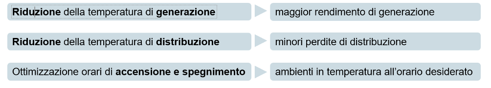 - Generazione e distribuzione del calore più efficienti, bilanciate con la reale necessità dell’edificio.