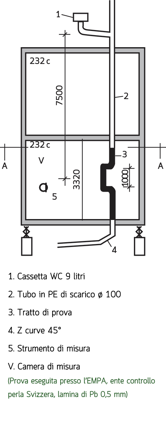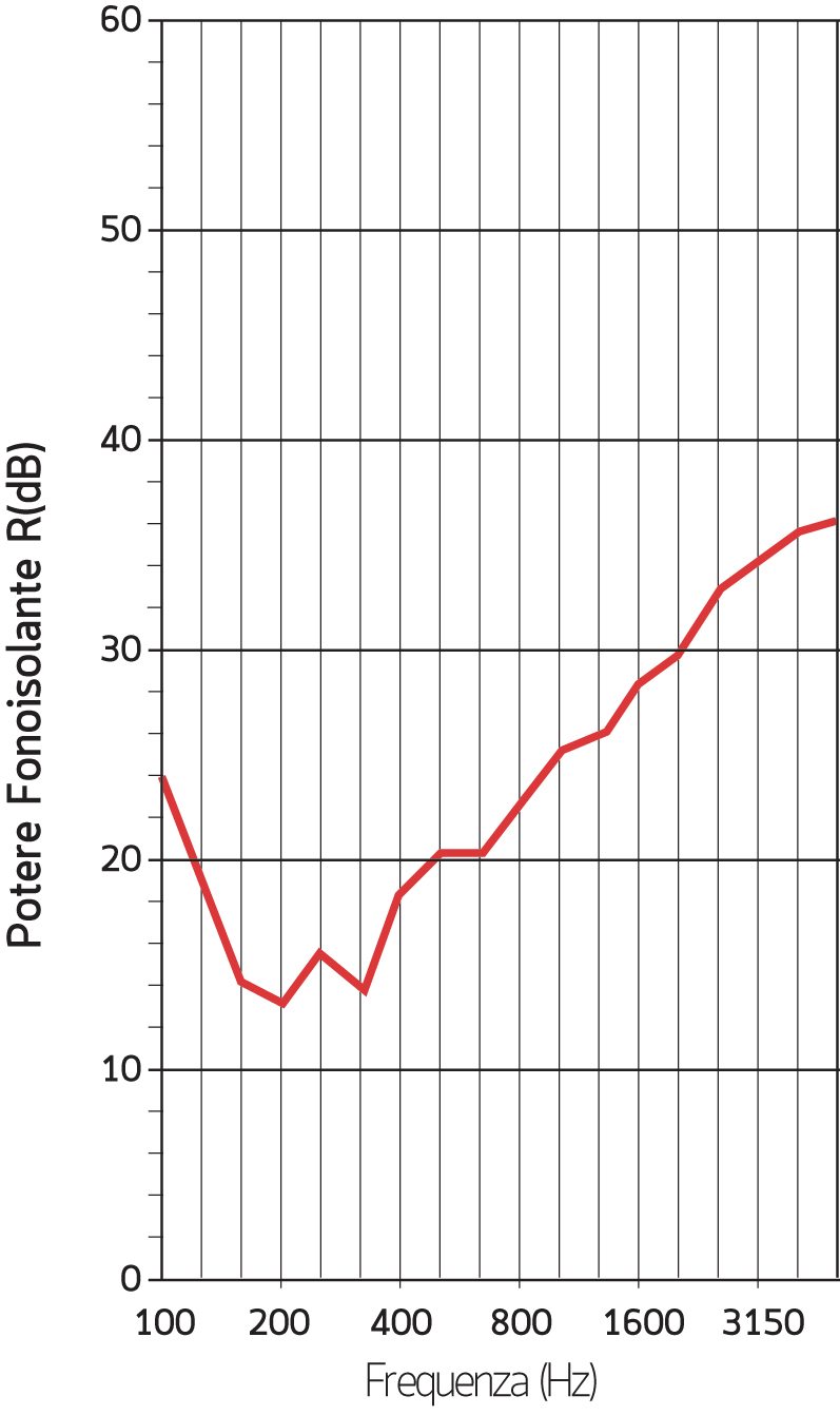 Per Isolamento acustico a parete: indice di valutazione, riferito alla curva campione a 500 Hz, calcolato nella banda compresa tra le frequenze di 100 e 3150 Hz (ISO 140/3, ISO 717/1): Rw = 26 dB