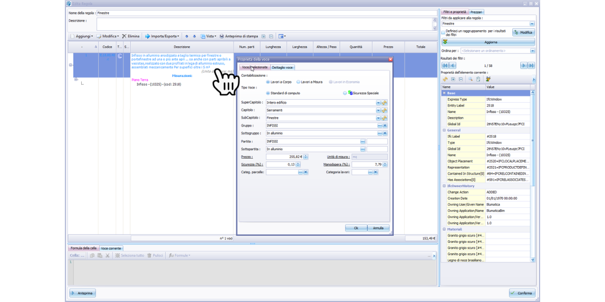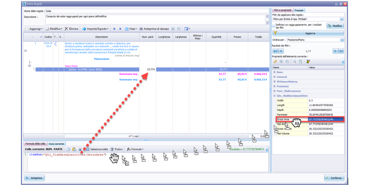 Per ogni filtro possono essere definite le regole di computo che si desiderano. Ad ogni regola di computo puoi associare diversi articoli di prezzario per computare le diverse lavorazioni. Ad esempio, per la regola che include il filtro muri, puoi computare, con una sola regola, le lavorazioni della muratura, la tinteggiatura interna ed esterna, ecc..