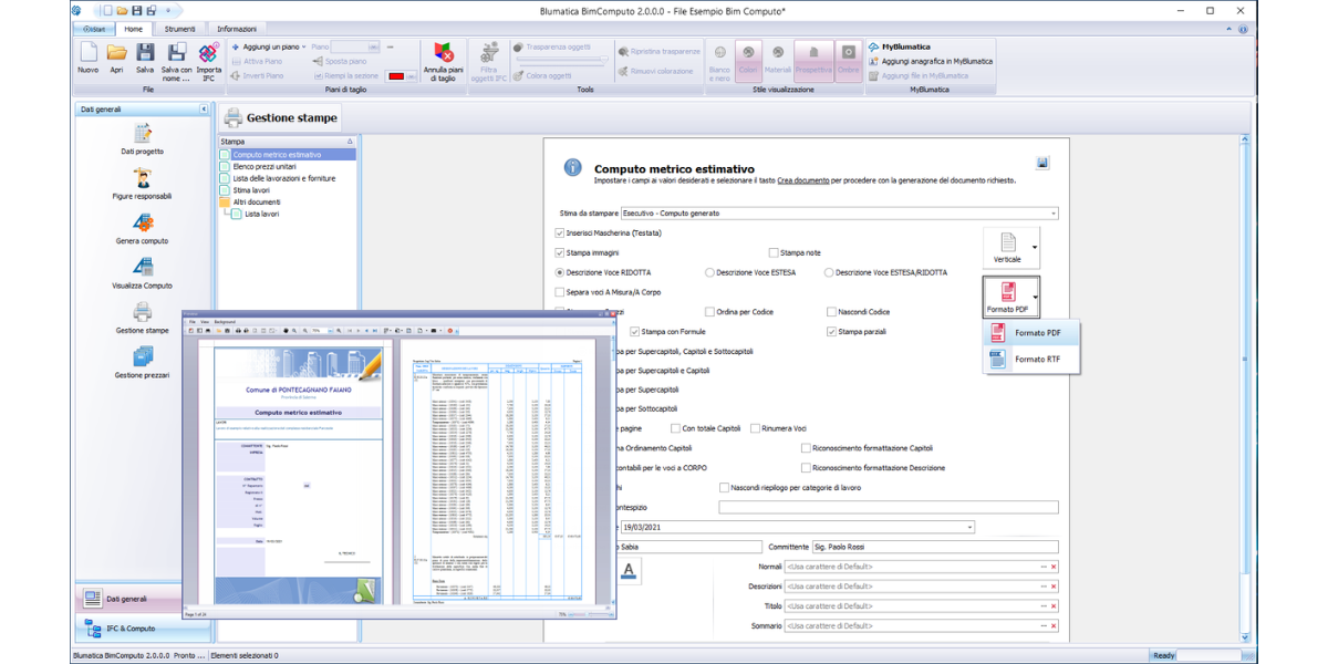 - Puoi riprodurre gli elaborati di stampa (computo metrico estimativo, elenco prezzi unitari, stima lavori, lista lavorazioni e forniture, lista lavori) oppure creare/aggiornare un file di Blumatica Pitagora.