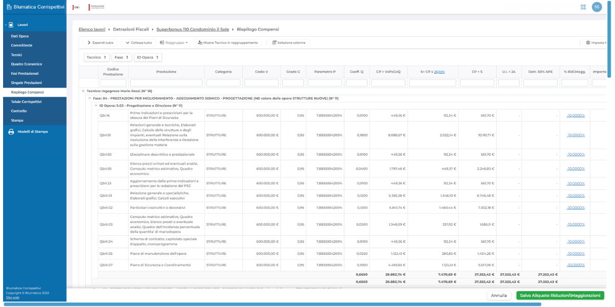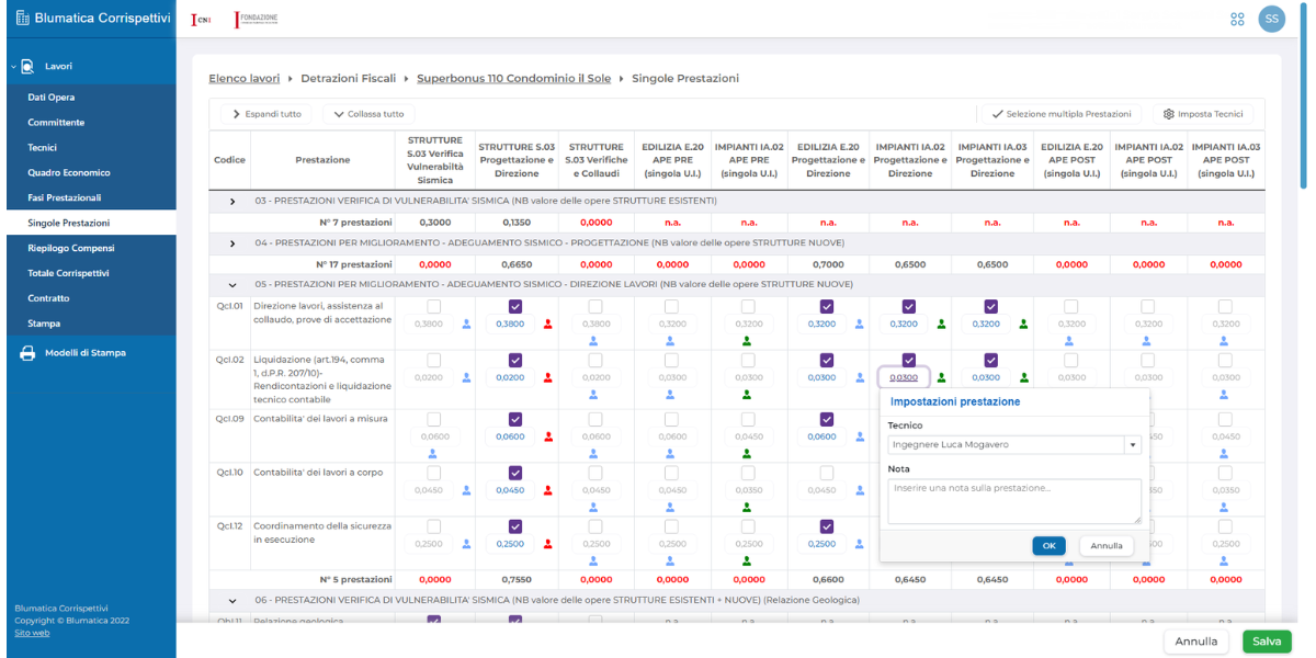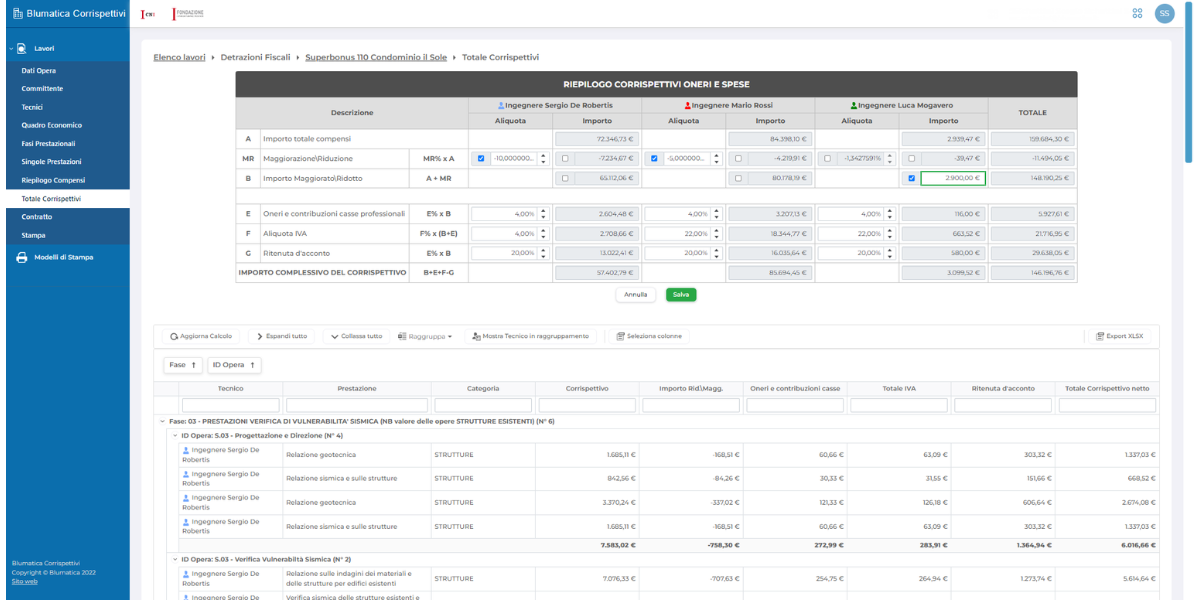 Gestione multi-tecnico in modo da calcolare in un unico progetto il compenso spettante a ciascun professionista.