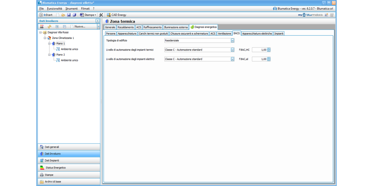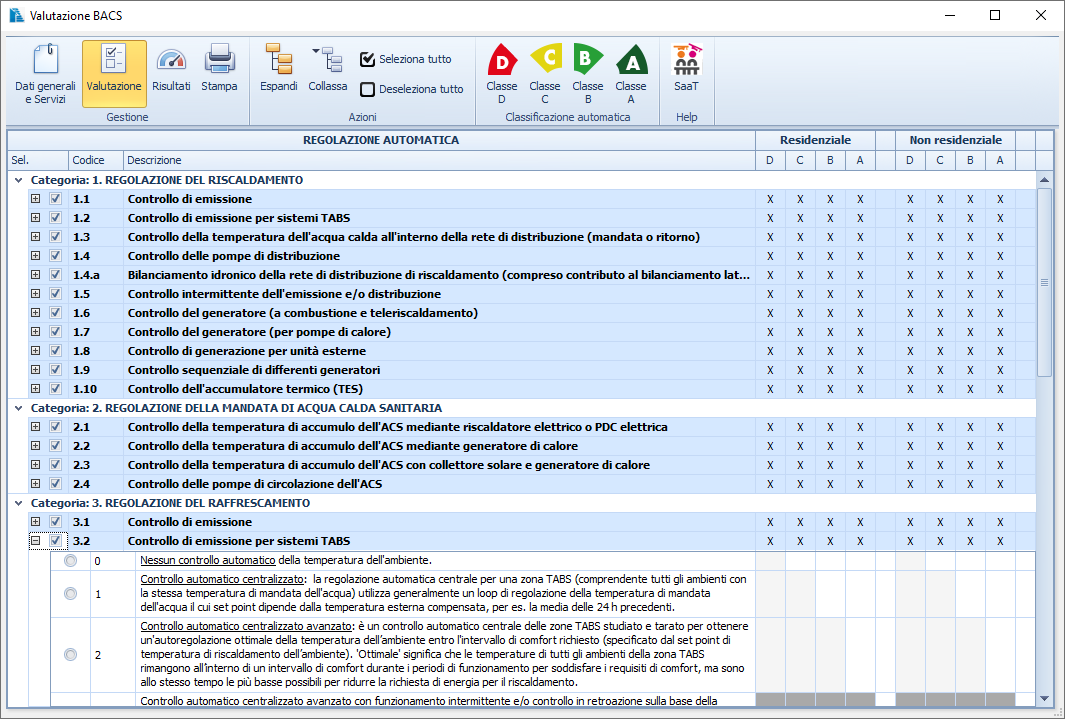 Analisi dei sistemi automazione e controllo dell’edificio (BACS) in conformità alla norma UNI EN ISO 52120:2022 per la valutazione della classe di automazione e del risparmio di energia primaria. Inoltre, è possibile stampare l’asseverazione del sistema BACS secondo la nuova UNI/TS 11651:2023.