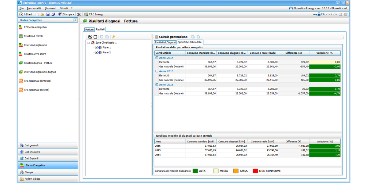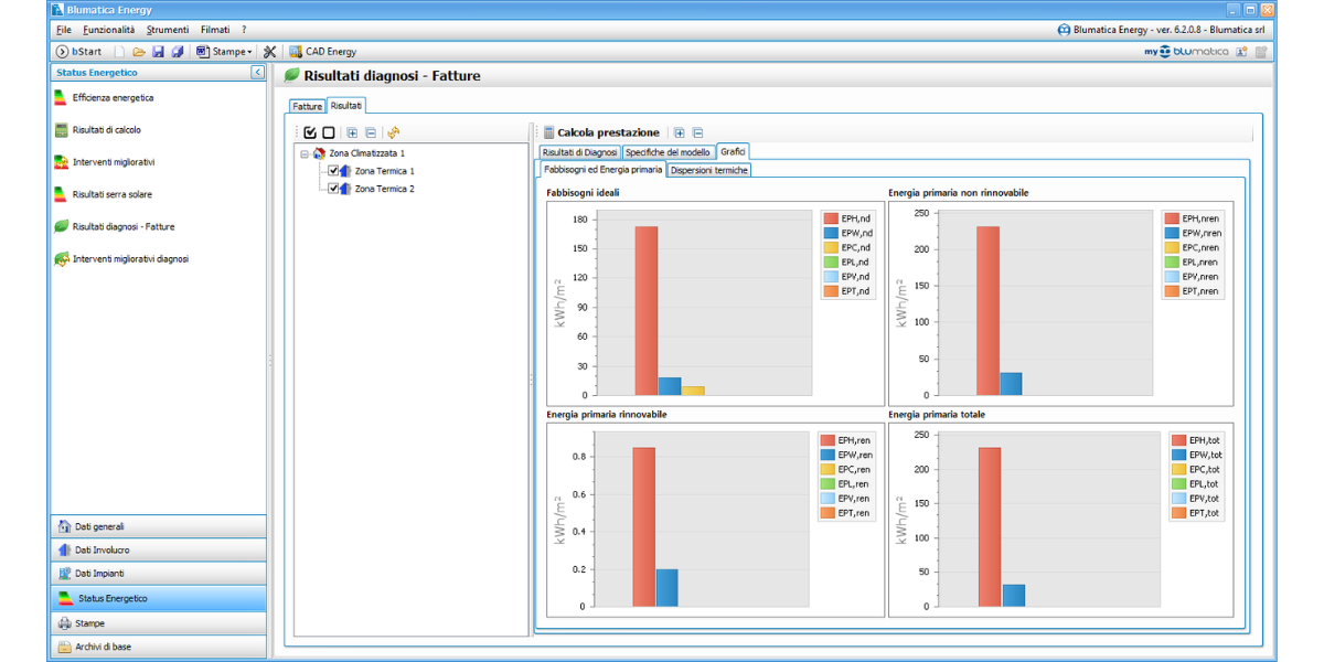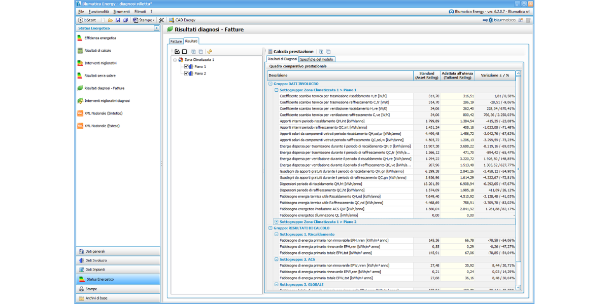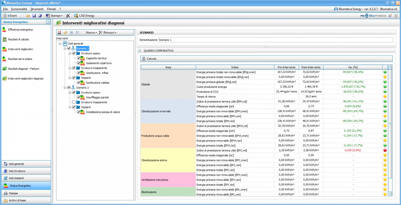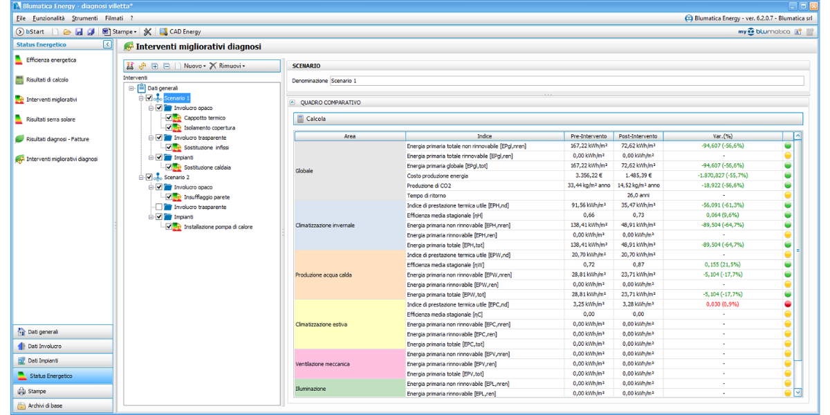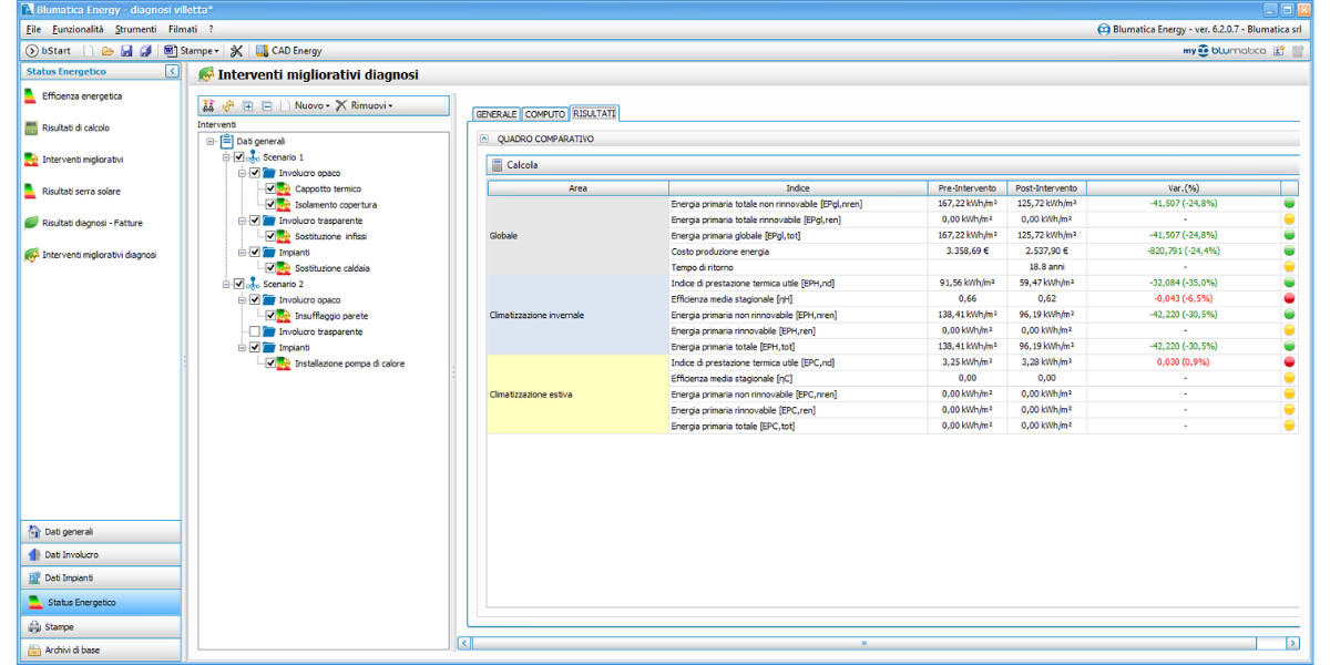 Tutti i risultati sono visualizzati sia in forma tabellare che mediante grafici interattivi, in modo da confrontare rapidamente sia i diversi scenari di riqualificazione che i miglioramenti energetici ottenuti.