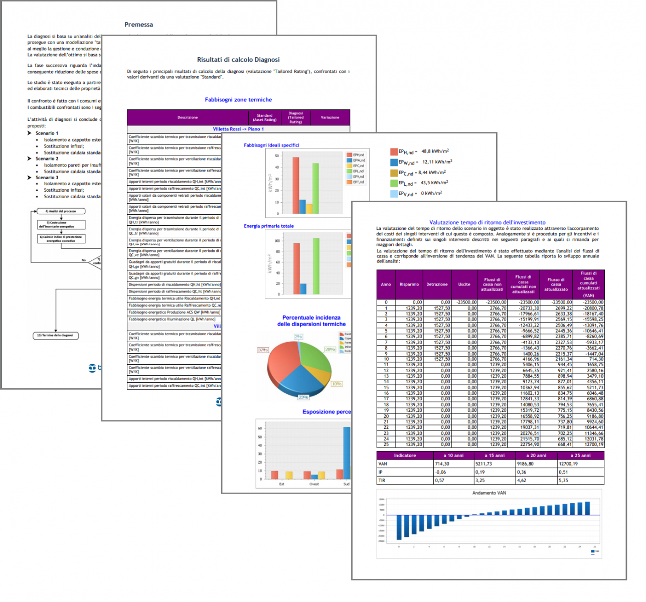 Redazione di una professionale relazione di diagnosi energetica con tutti i dati numerici dell’involucro e dell’impianto nonché i risultati degli interventi di miglioramento energetico.