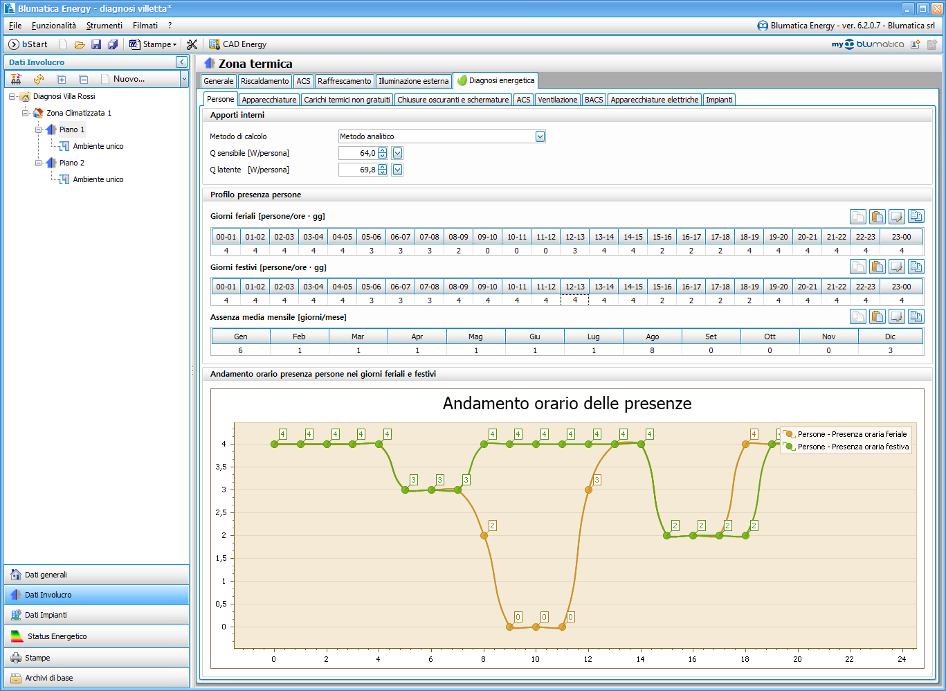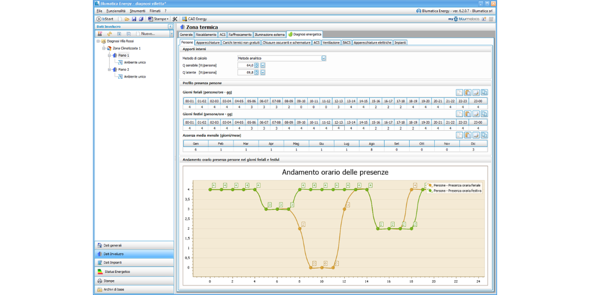 - Apporti interni dovuti a persone e apparecchiature con possibilità di definire differenti profili di occupazione nei giorni festivi, feriali e di assenza