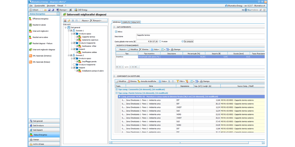 Il software consente di gestire differenti scenari di miglioramento energetico, ciascuno costituito da differenti tipologie di intervento (componenti opachi, finestrati, generatori, sottosistemi impianto lato utenza, fonti rinnovabili, illuminazione, ventilazione, ecc.). Per ciascuno scenario è possibile effettuare un’analisi dei costi e dei benefici calcolando i risparmi energetici, la riduzione di emissioni di inquinanti, gli indicatori economici (VAN, IP, TIR) secondo la UNI EN 15459.
