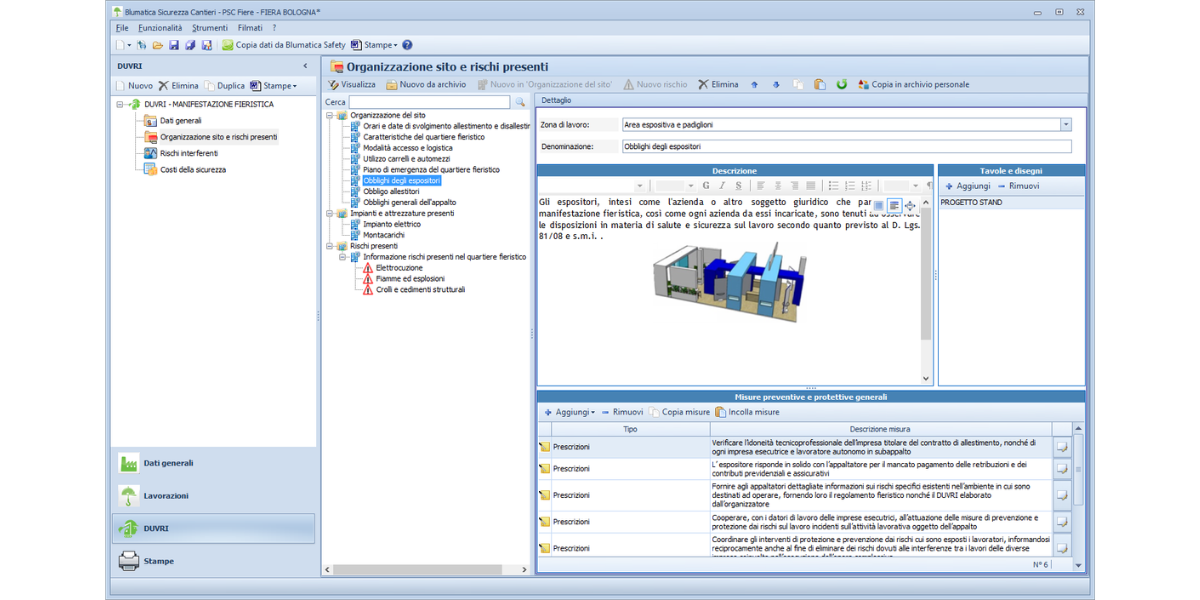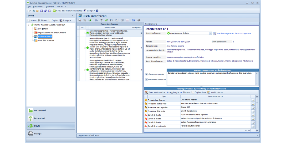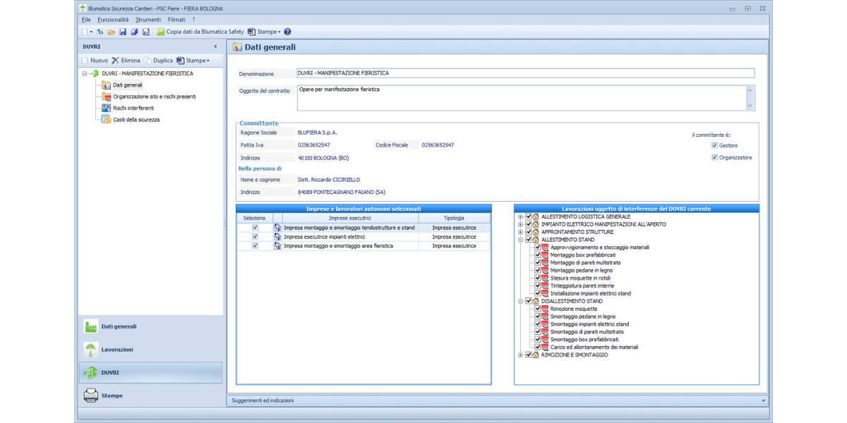 Redigi il D.U.V.R.I. con estrema rapidità, selezionando gli esecutori e le lavorazioni già definite nel piano di sicurezza. Il D.U.V.R.I. specifico per ogni manifestazione (richiesto dal Capo II Manifestazioni Fieristiche) è già preimpostato, con coordinamento delle lavorazioni interferenti e in linea con i contenuti dell’Allegato V del Decreto Interministeriale 22 Luglio 2014.