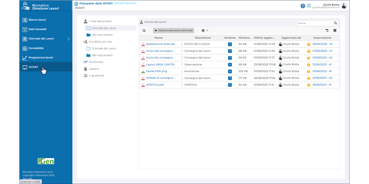 - L’applicazione è dotata di un ACDat interno da cui è disponibile sia la documentazione prodotta in automatico che quella archiviata da ogni utente.