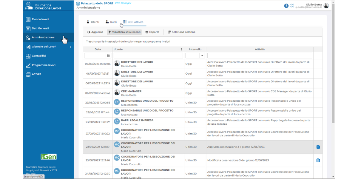 Per gli utenti con ruolo CDE Manager è disponibile un vero e proprio registro con il dettaglio delle azioni eseguite da ogni utente a partire dal singolo accesso al lavoro.