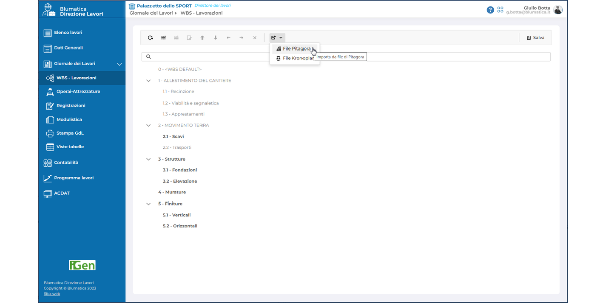 - Definisci o acquisisci da Blumatica Pitagora o Blumatica Kronoplan la WBS dei lavori a cui riferire le singole annotazioni