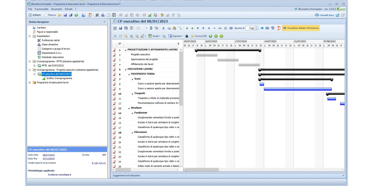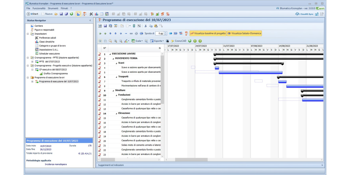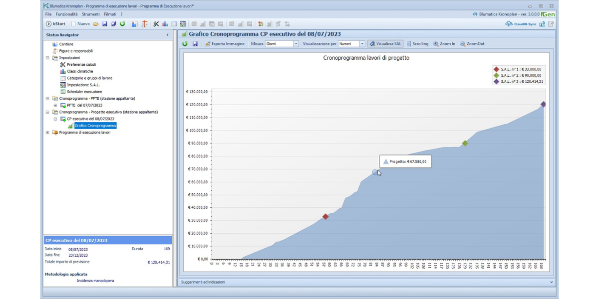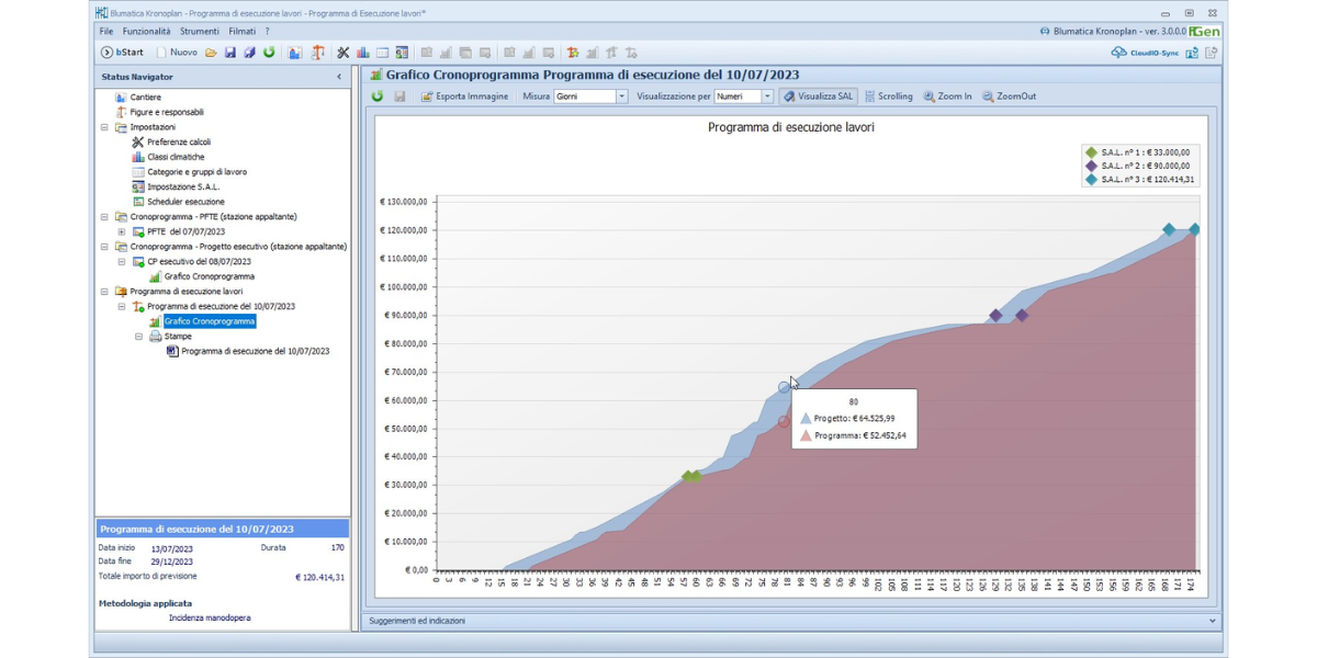 Il programma di esecuzione dei lavori fornisce le variazioni rispetto al progetto sia nel diagramma di Gantt per ogni singola attività, sia nel grafico di cronoprogramma economico tramite l’indicazione degli importi maturati ad ogni giorno.
