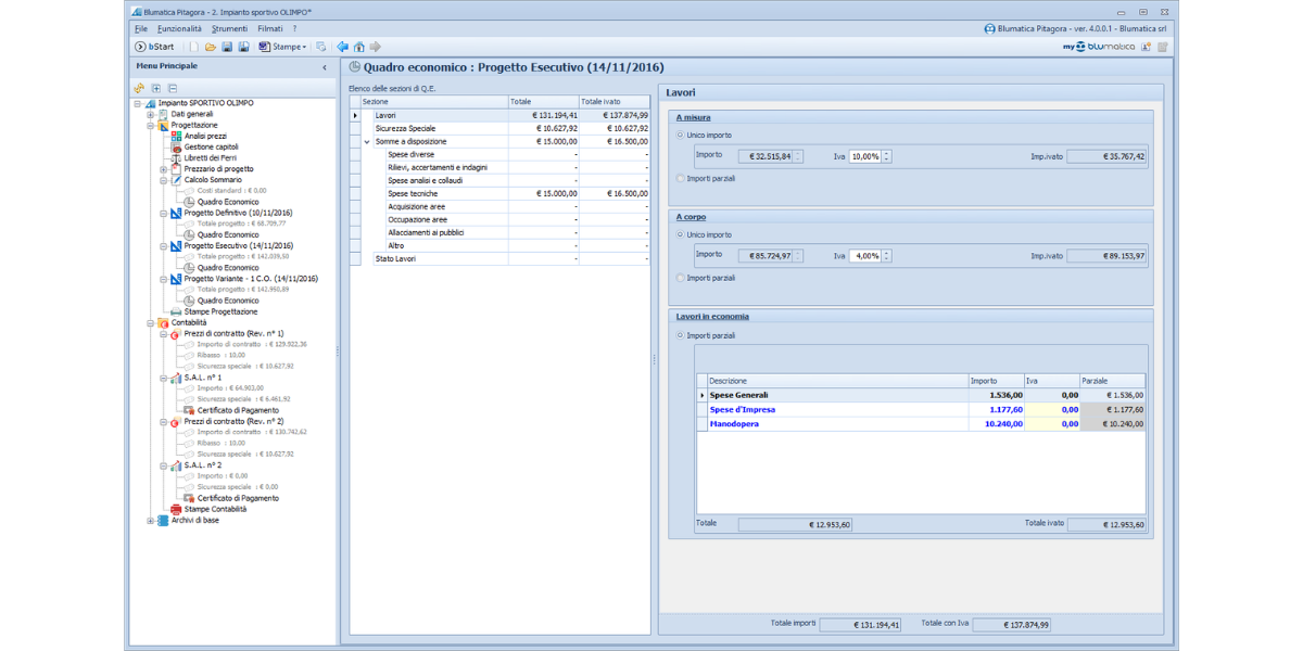 Perché ti aiuta a predisporre la documentazione relativa alla contabilità preventiva e consuntiva da trasferire, in automatico, alle altre applicazioni Blumatica per la redazione di tutti gli elaborati di progetto: cronoprogramma dei lavori, piano di manutenzione dell'opera, capitolato speciale d'appalto, piani di sicurezza, fascicolo tecnico con le caratteristiche dell'opera, calcolo dei corrispettivi, ecc.
