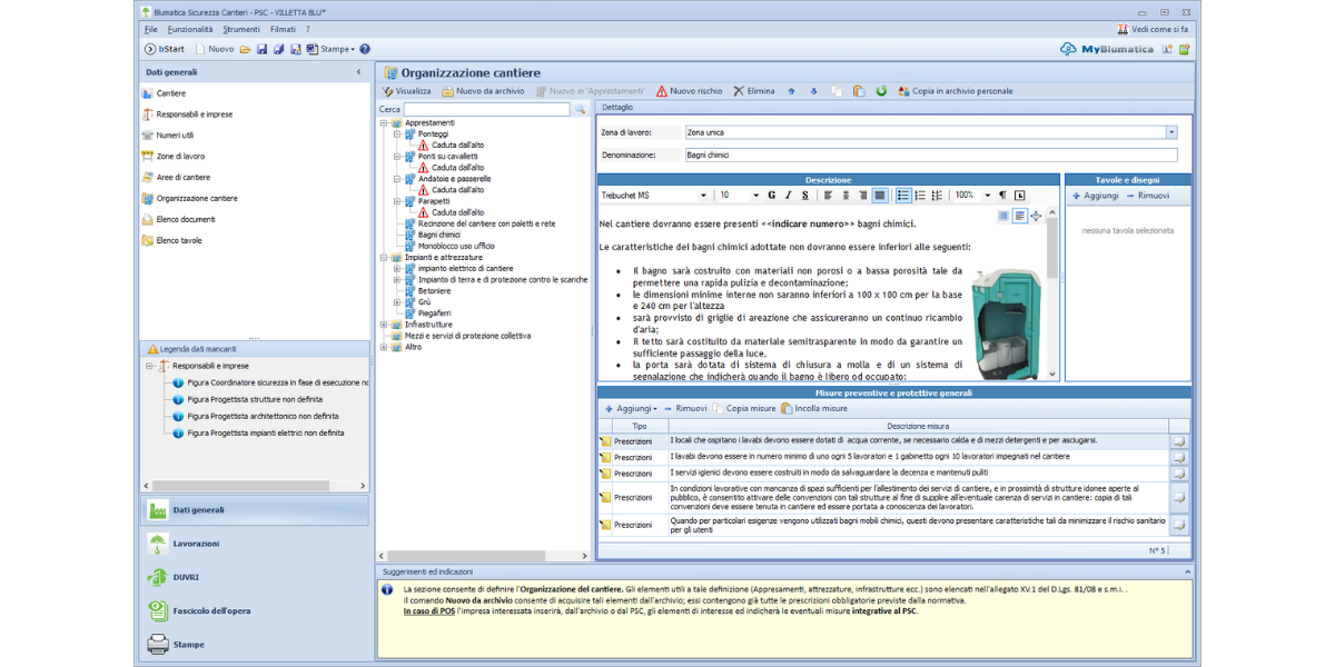 Banca dati per ogni argomento: Per ogni elemento di analisi e fattori di rischio da includere nelle relazioni (aree di cantiere, organizzazione di cantiere, interferenze, lavorazioni, ecc.) è disponibile la banca dati già corredata delle misure di coordinamento obbligatorie.