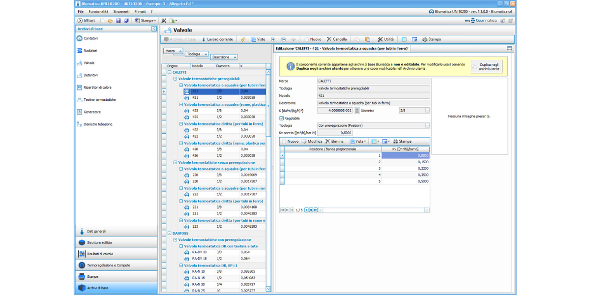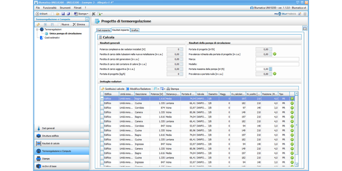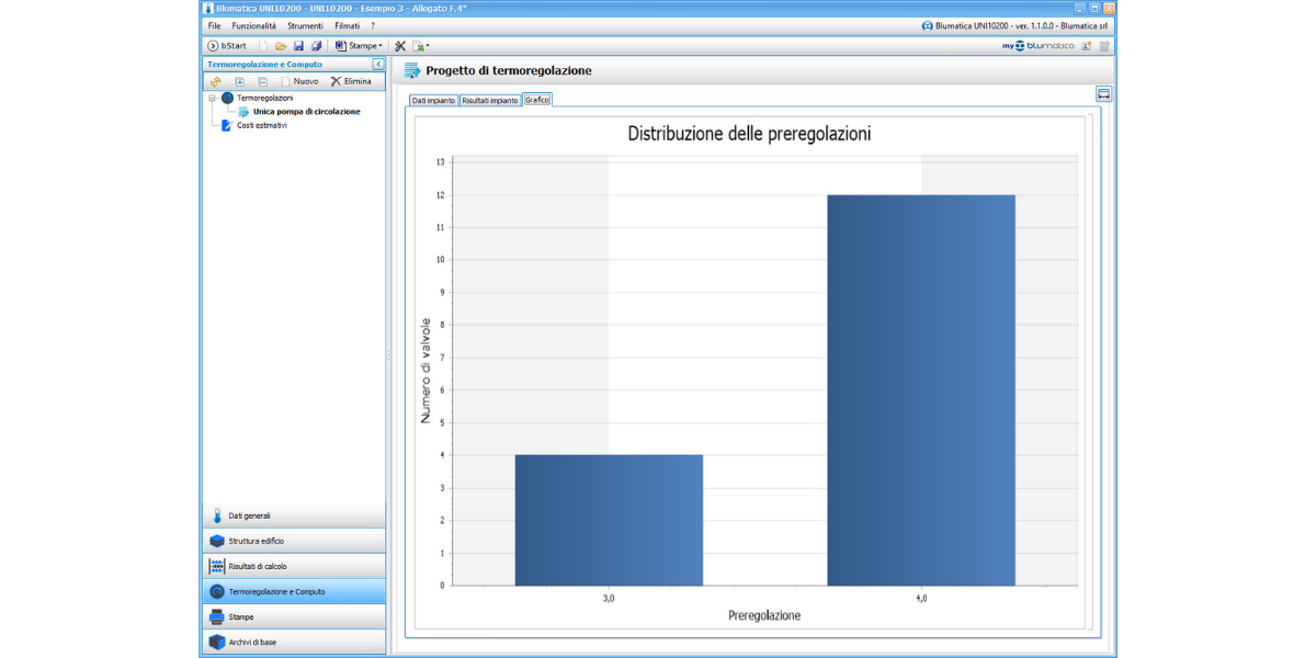 Progetto dell’impianto di termoregolazione per calcolare le bande proporzionali o i gradi di preregolazione delle valvole termostatiche, con rappresentazione grafica sotto forma di istogramma.