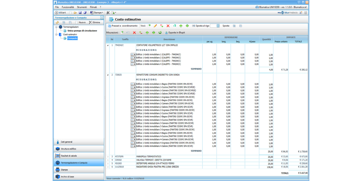 Computo metrico dei componenti dell’impianto: mediante un editor dedicato è possibile generare in automatico il computo metrico dei componenti dell’impianto (valvole, contatori, ripartitori, pompe, testine termostatiche, generatori, ecc.).