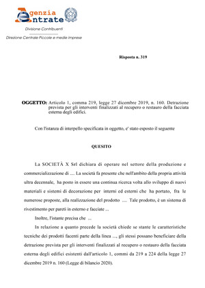 In un’istanza di interpello motivata ha chiesto se uno dei propri prodotti, appena commercializzato, sulla base delle sue specifiche tecniche, possa essere utilizzato nel corso di interventi volti al recupero delle facciate esterne rientranti nella detrazione.