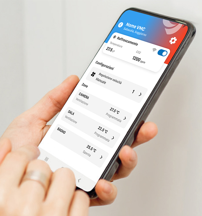 La gestione di Comfort One è affidata a un’elettronica evoluta, facilmente utilizzabile sia tramite pannello touch screen VMCDISPLAY sia con l’app dedicata Vmc Controller, che consente la regolazione a distanza. L’utente può impostare velocità di ventilazione, modalità estate/inverno, setpoint e fasce orarie, personalizzando il funzionamento in base alle proprie abitudini quotidiane.