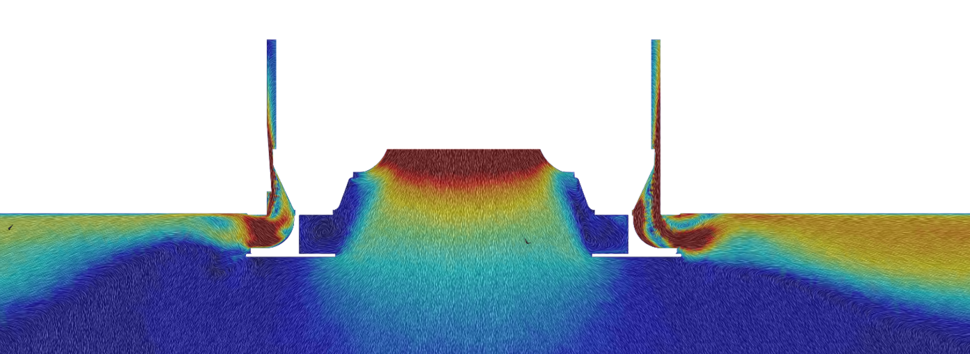La geometria dei convogliatori del modulo EFFETTO è stata ottimizzata tramite simulazioni fluidodinamiche computazionali (CFD), che hanno permesso di analizzare nel dettaglio il comportamento del flusso d’aria. L’adozione dell’effetto Coandă permette all’aria di aderire al soffitto e alle pareti, diffondendosi omogeneamente nell’ambiente senza creare getti d’aria fastidiosi o aree di flusso diretto sugli occupanti. Questa caratteristica è particolarmente rilevante in ambienti ad alta densità come uffici open space e ristoranti, dove il comfort deve essere garantito per un numero elevato di persone.