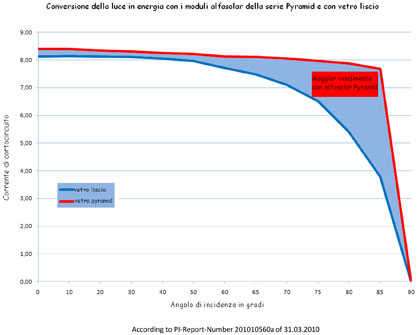 RENDIMENTO SUPERIORE, PERCHÉ?La superficie del vetro a forma piramidale funziona come una sorta di trappola di luce che porta ad un aumento del rendimento anche con bassi angoli di incidenza dei raggi solari, consentendo la produzione di energia per un periodo di tempo più lungo, dalla mattina presto fino al tramonto. Inoltre la resa è ottimale anche con orientamenti dell’impianto fotovoltaico sfavorevoli. alfasolar è stata la prima ad usare questo tipo di tecnologia (2006) che riduce la riflessione dei raggi solari nell'atmosfera reindirizzando parte dei raggi rifratti sulle celle. Lo spessore del vetro di 4 mm, l’alta trasparenza con basso contenuto di ferro e la microstruttura non porosa ed estremamente liscia della superficie, garantiscono ottime proprietà meccaniche, elevata trasmissione della luce ed un effetto auto-pulente. alfasolar raggiunge ottime prestazioni anche a carico parziale, utilizzando celle solari selezionate e una saldatura dei contatti elettrici particolarmente efficiente. Le caratteristiche elettriche dei moduli permettono al Pyramid, con i suoi picchi d’efficienza del 15,4% (16,3% per il monocristallino), di distinguersi tra i pannelli concorrenti, fornendo così un ottimo rapporto potenza/superficie. In sintesi, i vantaggi dei moduli Pyramid sono: Le prestazioni dei moduli alfasolar Pyramid sono suffragate dagli studi sul vetro piramidale condotti dal Photovoltaik-Institut Berlin AG. QUALITÀ SUPERIORE, PERCHÉ?alfasolar punta da sempre sulla qualità dei suoi prodotti e ne fa un vero punto di forza e di differenziazione sul mercato. Questo è possibile grazie ad una ventennale esperienza nel settore, ad un know-how tedesco e all’utilizzo di soli componenti di alta qualità, tra i quali celle con punte d’efficienza del 17%. Pertanto, la garanzia di 10 anni sul prodotto e quella lineare di 25 anni sulle prestazioni è una ulteriore conferma della qualità dei moduli alfasolar. |