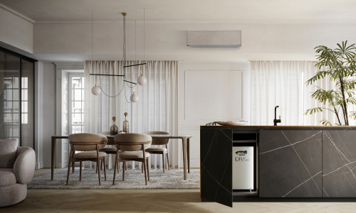 L'unità motocondensante è completamente nascosta e può essere installata in spazi interni ridotti, come mobili da cucina, vani tecnici o sotto il lavello, preservando l'integrità estetica delle facciate esterne.