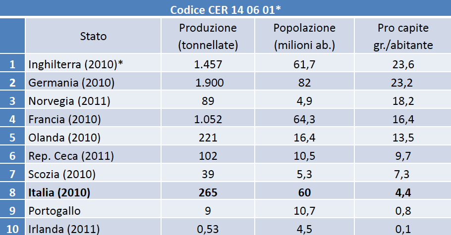 Il dossier di Legambiente si concentra particolarmente sul fine vita utile degli impianti e delle apparecchiature che li hanno utilizzati e, come si vede dal grafico sottostante, l'Italia si colloca agli ultimi posti nella graduatoria europea dei Paesi virtuosi nel recupero dei refrigeranti (Rapporto Legambiente).