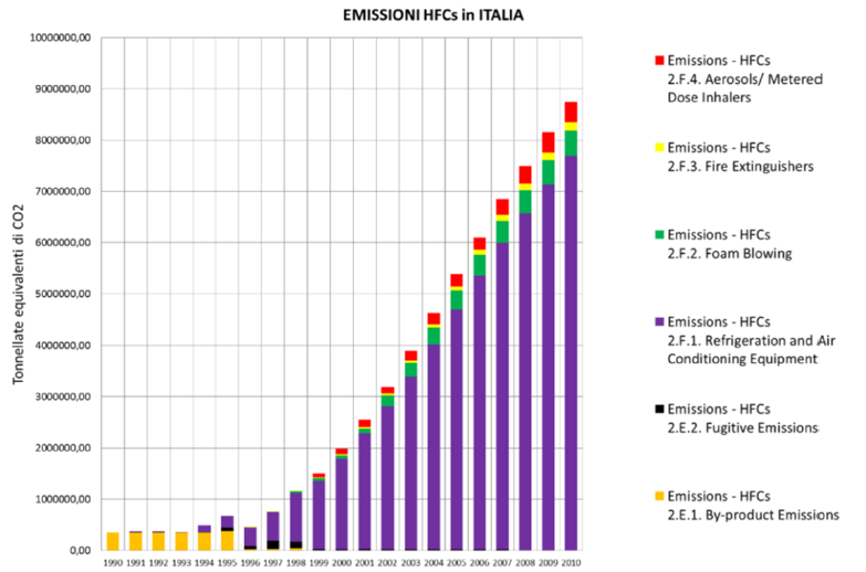 A livello europeo, secondo il rapporto Legambiente, attualmente vi sono infatti 1,5 milioni di tonnellate di gas refrigeranti negli apparecchi di condizionamento e refrigerazione domestici e commerciali, con un potenziale emissivo di oltre 5 miliardi di tonnellate di CO2 equivalenti.