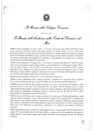 La conferma della raggiunta intesa è stata confermata nel fine settimana con un Report ufficiale della Conferenza che, al punto 7, annuncia la sancita intesa “sullo schema di decreto del Ministro dello sviluppo economico recante modifica e aggiornamento degli obiettivi quantitativi nazionali di risparmio energetico che devono essere perseguiti dalle imprese di distribuzione dell’energia elettrica e il gas per gli anni 2017-2020 e per l’approvazione delle nuove Linee guida per i progetti di efficienza energetica”.
