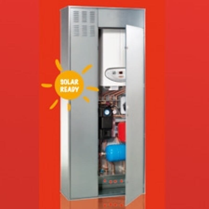Le soluzioni da interno, dotate di armadio tecnico DOMUS Container (completo di 5 piedini di appoggio regolabili), consentono l’alloggiamento ordinato della caldaia e del circuito solare in soli 36,5 cm di profondità e non prevedono predisposizioni murarie. Si tratta di un prodotto di facile ambientazione in qualsiasi locale grazie al design sobrio e al mantello di colore bianco.