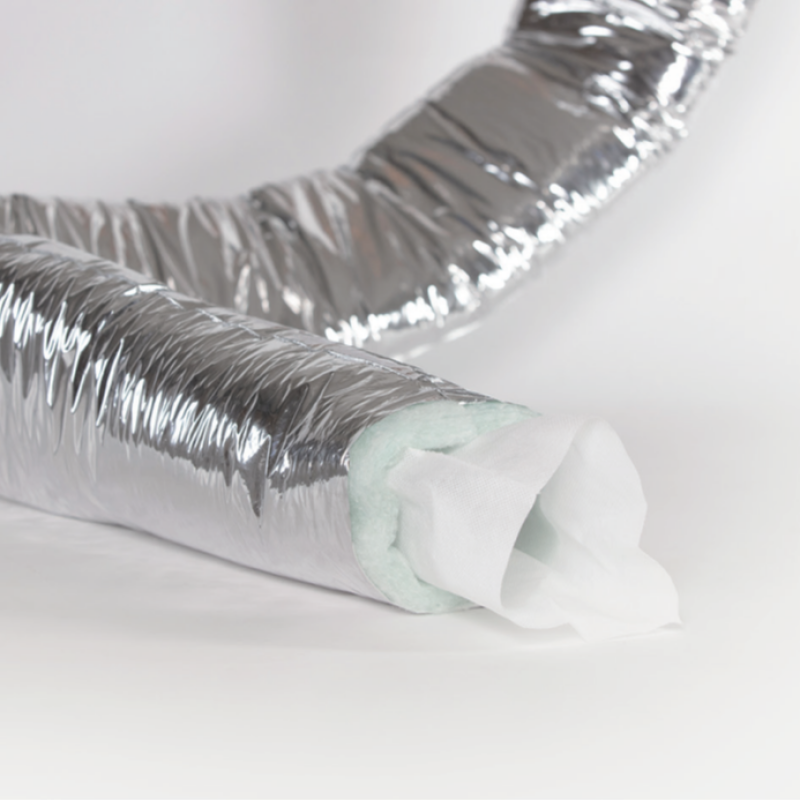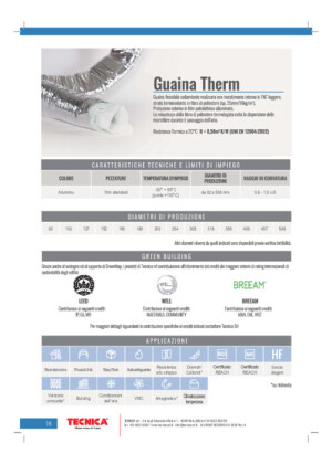 Guiana flessibile coibentante realizzata con rivestimento interno in TNT leggero, strato termoisolante in fibra di poliestere (sp. 25mm/16Kg/m3).