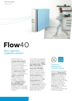 Nella versione più accessoriata, Flow40 prevede l’integrazione con sensori CO₂ e VOC e consente la gestione e il monitoraggio da remoto tramite app Helty Home, con la visualizzazione in tempo reale dei dati e la possibilità di impostare scenari di funzionamento personalizzati.