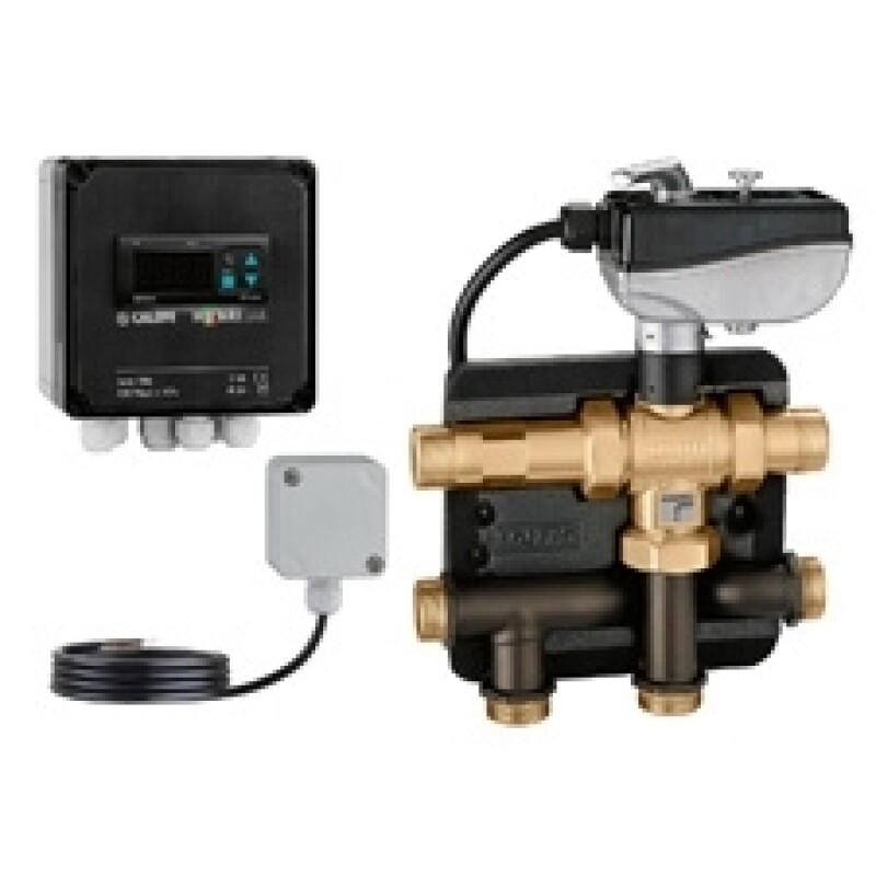 Il gruppo ibrido preassemblato Hybrical ® di Caleffi permette di collegare tra loro i circuiti idraulici delle caldaie, delle Pompe di calore e dei terminali che servono all’impianto, gruppi costituiti da un kit di deviazione con valvola deviatrice più collettore e di un regolatore elettronico di comando dotato di sonda esterna. La centralina di regolazione serve ad assicurare il funzionamento automatico alternativo della PDC e della caldaia.