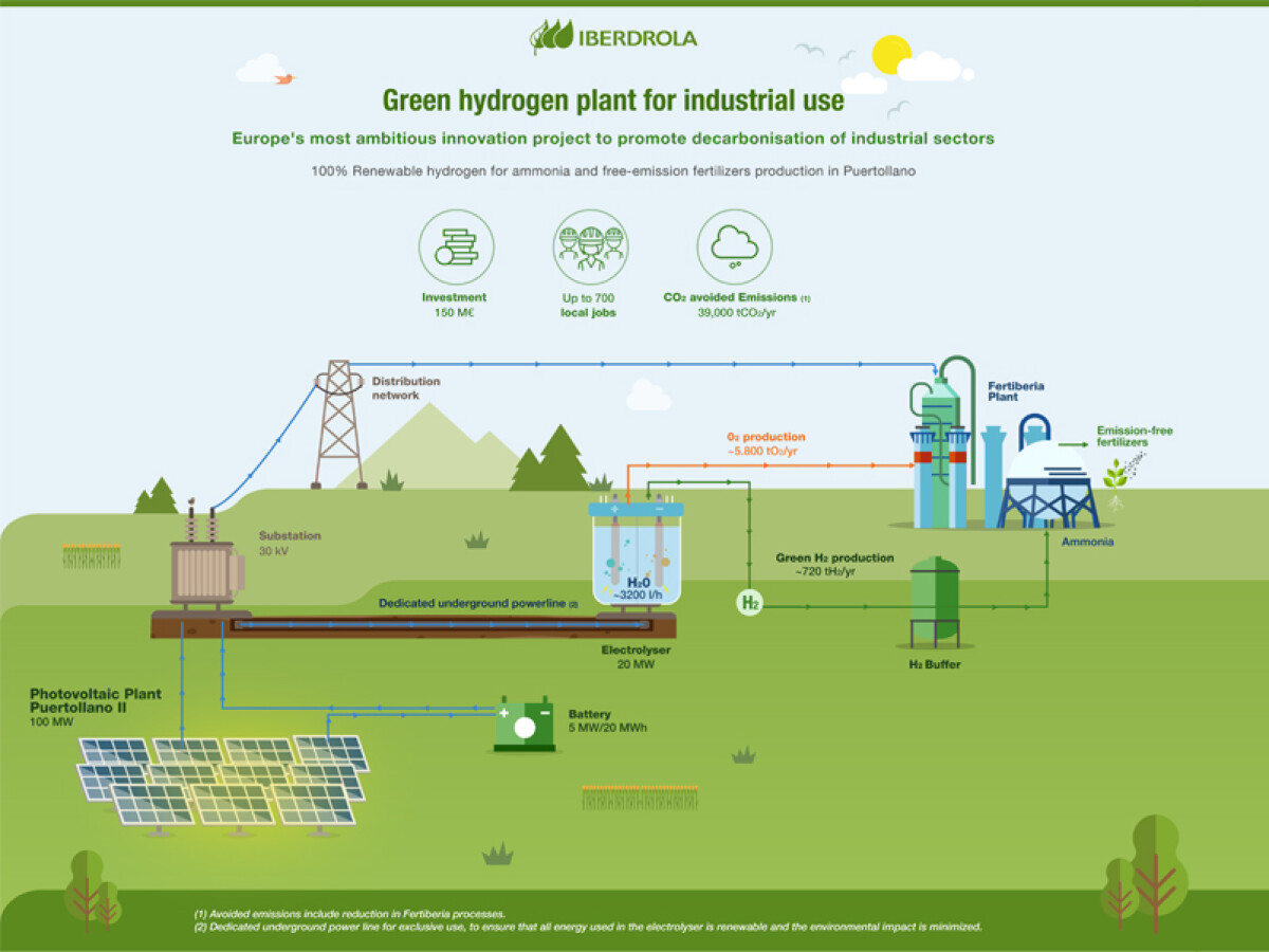 L’idrogeno che sarà prodotto verrà utilizzato nell’impianto di produzione di ammoniaca di proprietà di Fertiberia, a Puertollano, già noto nel settore per essere uno degli stabilimenti più efficienti d’Europa, con una capacità di più di 200.000 t/anno.