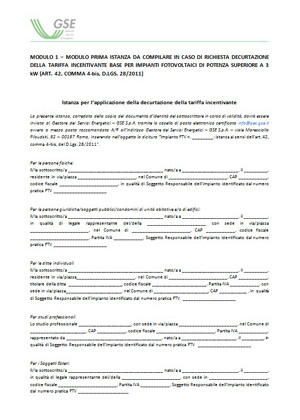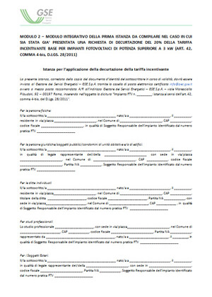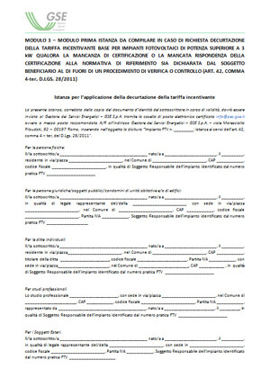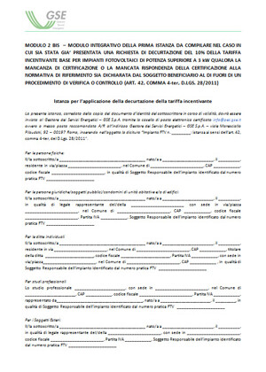 Sulla base di questa nuova possibilità di revisione delle tariffe incentivanti ai Soggetti Responsabili che beneficiano del Conto Energia in quanto titolari di impianti FV con potenza nominale superiore a 3 kW, ma che in seguito a verifiche o controlli sono risultati non certificati o accompagnati da certificazioni non conformi, è data la possibilità di aprire un’istanza ai sensi del comma 4-bis dell’art. 42. La richiesta di riconoscimento della tariffa deve essere inviata a mo’ di dichiarazione sostitutiva di atto di notorietà nella forma del modulo 1 scaricabile alla fine del testo.