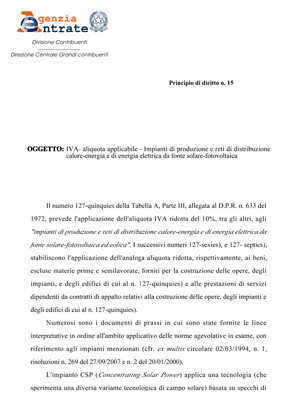 Anche gli impianti fotovoltaici a concentrazione solare prevedono l’applicazione dell’aliquota IVA ridotta al 10% in quanto rientrano a pieno titolo nella definizione di “impianti di produzione e reti di distribuzione calore-energia e di energia elettrica da fonte solare-fotovoltaica ed eolica", lo ha confermato l’Agenzia delle Entrate con un Principio di Diritto pubblicato nei giorni scorsi.