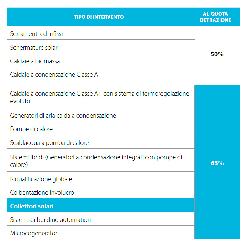 Nell’ampio ventaglio di detrazioni fiscali che il sistema italiano mette a disposizione dei cittadini per la riqualificazione energetica dei fabbricati rientrano anche gli impianti realizzati con pannelli solari ibridi. Come evidenziato nella tabella qui di seguito infatti questa tipologia di sistemi può usufruire dell’aliquota al 65% prevista per l’installazione di collettori solari.