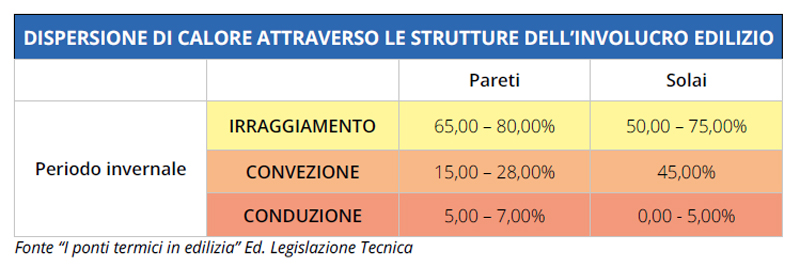 Da verifiche effettuate è stato rilevato che le percentuali di scambio di calore attraverso le superfici si suddividono nelle percentuali riportate nella tabella successiva.