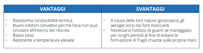 Oltre ad essere super-leggero, l’aerogel è un isolante termico ottimo che resiste a temperature altissime. Di contro, se l’Aerogel viene sottoposto a sollecitazioni si sbriciola. Basta sfregarlo tra le dita perché ne rimanga soltanto una finissima polvere. Negli ultimi anni, sono state sviluppate tecnologie tali da permettere l’utilizzo di questo materiale direttamente nell’intonaco con conseguenti vantaggi nel campo delle ristrutturazioni e per la riduzione complessiva dello spessore delle strutture edilizie.