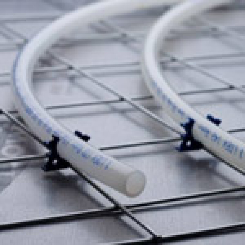 Una rete metallica assieme alle clips di fissaggio assicura la corretta e vincolata posa delle tubazioni. La rete è dotata di piedino rialzato che solleva la tubazione in modo che venga completamente avvolta dal massetto per una maggiore superficie di scambio. Il risultato finale è una temperatura dell’acqua di alimentazione minore a parità di resa termica. Il sistema di posa comprende anche una striscia di bordo, che crea una barriera isolante tra il massetto e le pareti, e un foglio in polietilene, che protegge dall’umidità ed evita la formazione di ponti termici. In questo modo la posa in opera di Loex home X17 è semplice e rapida, adattandosi a tutte le geometrie e riducendo gli sfridi.