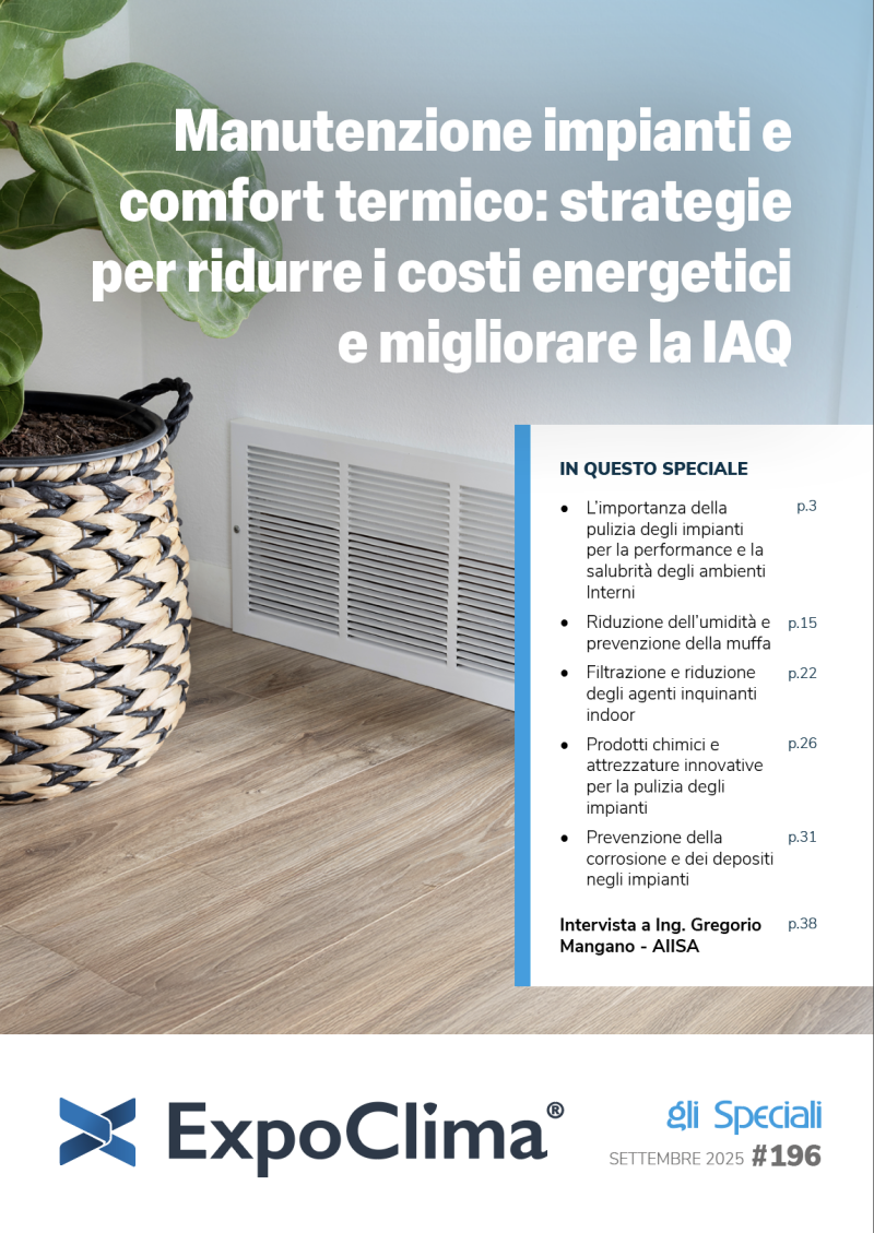 Lo speciale di settembre di ExpoClima è dedicato proprio a questo tema: un approfondimento che intreccia analisi tecnica, riferimenti normativi e visioni prospettiche, arricchito dall’intervista esclusiva all’Ing. Gregorio Mangano, Presidente AIISA e CEO di Techno One. Dalla correlazione tra pulizia e performance energetiche alle criticità generate da umidità e muffe, dalle innovazioni chimiche e tecnologiche fino all’evoluzione dei criteri ESG e CAM, emergono scenari chiari: la manutenzione degli impianti non è più una semplice pratica operativa, ma un requisito strategico per la sostenibilità, la salute e la competitività del settore.