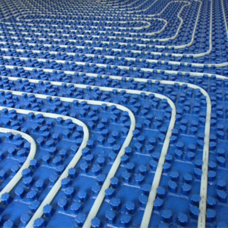 - sistemi con tubazioni integrate nell’isolante, da posarsi direttamente su soletta, al di sopra dei quali possono essere posati, prima della pavimentazione, un massetto a basso spessore o una doppia lastra di lamiera d’acciaio zincata (capace di conferire minore inerzia termica e maggiore uniformità di distribuzione del calore del vettore termico) o un massetto a secco (costituito da pannelli in poliuretano espanso o in polietilene espanso, o composti da fibra di legno, sughero o da granulati di roccia; tali materiali, in alcuni casi, sono accoppiati con uno strato preincollato, solitamente di alluminio, che ne garantisce/aumenta la conducibilità termica);
