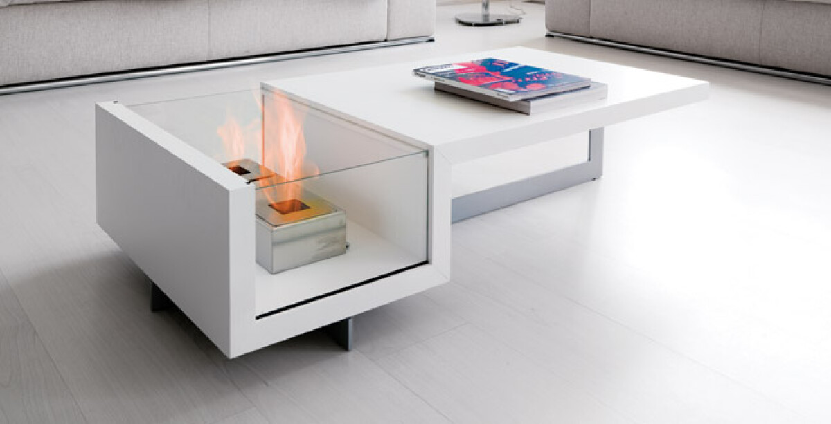 Nell´immagine: Tavolino da salotto con biocamino incorporato, dotato di bruciatore e kit comprensivo di accendino lungo, imbuto, coperchio per spegnimento fiamma.