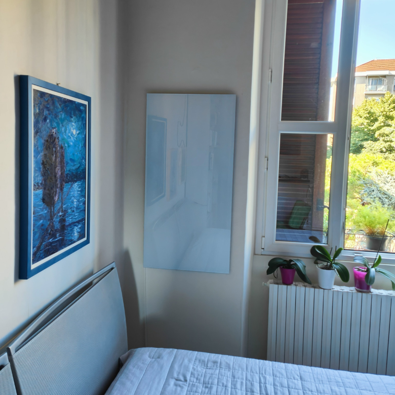 Disponibili in diverse finiture (alluminio bianco, vetro bianco o nero e specchio), i pannelli si integrano in qualsiasi ambiente, sia residenziale che commerciale. Il design ultrasottile (solo 2,5 cm) consente una posa a parete, soffitto o controsoffitto senza interventi invasivi. Sono inoltre disponibili versioni portatili con supporto da terra.