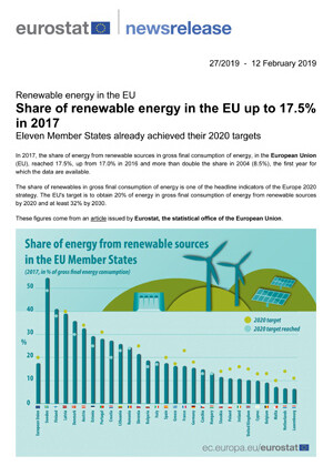 I risultati complessivi di utilizzo di energia da fonti rinnovabili in UE nel 2017 sono positivi: è stato superato il target al 2020