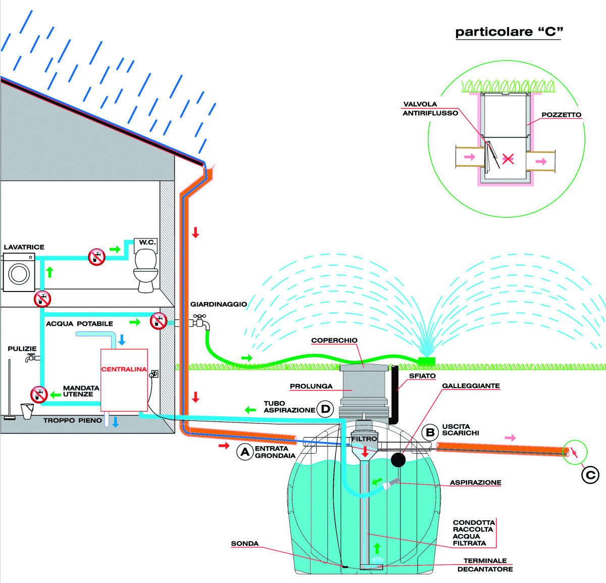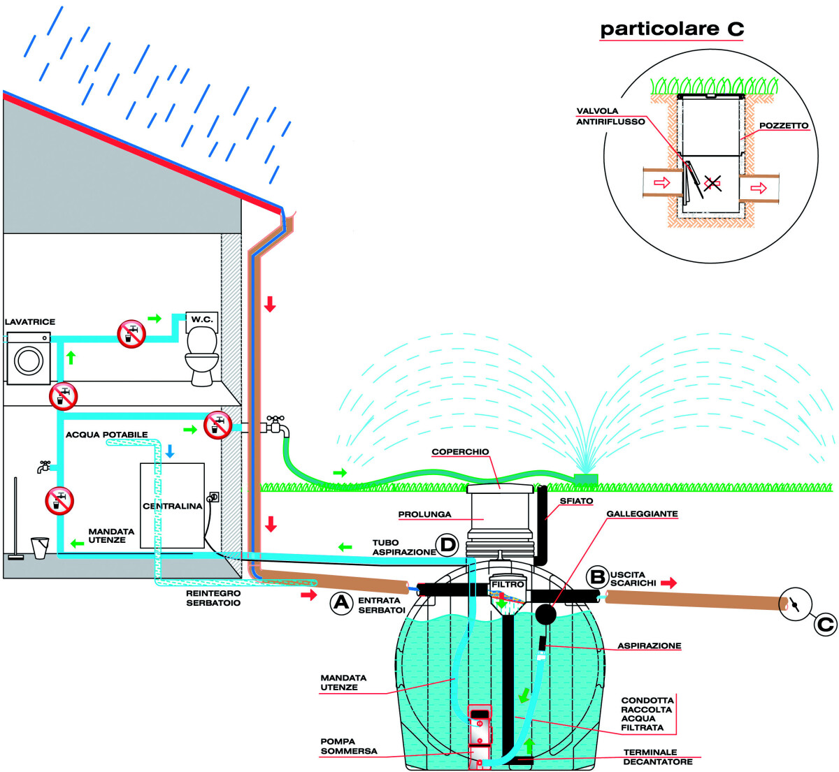 Sfruttando la pendenza del tetto di casa, la pioggia si incanala nelle grondaie e, tramite un condotto, viene convogliata verso il filtro all’interno del serbatoio. Il filtro è inclinato, in modo tale che i residui filtrati siano trascinati verso il condotto di scarico. In questa fase, quindi, l’acqua viene separata dalla sporcizia e poi incanalata all’interno del serbatoio tramite una tubazione (terminale decantatore) la cui parte finale è rivolta verso l’alto per non creare turbolenze che potrebbero smuovere eventuali sedimenti sul fondo del serbatoio.