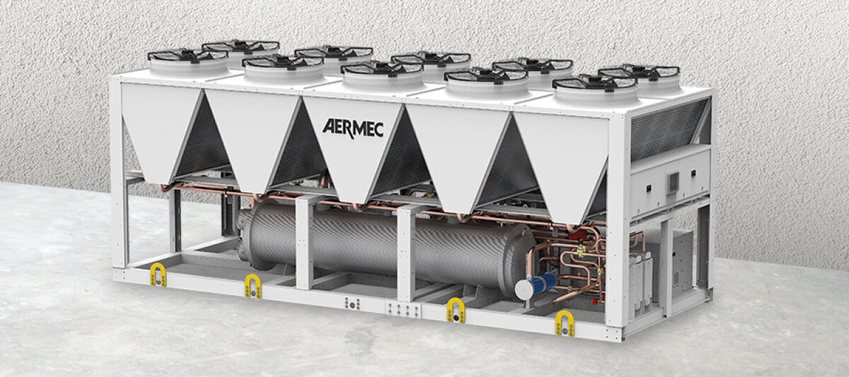 Aermec presenta la nuova serie di refrigeratori aria-acqua TBA/TBG per applicazioni ad altissima efficienza sia a pieno carico che ai carichi parziali.