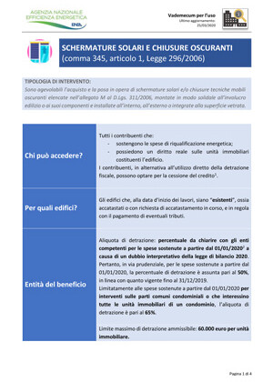 Il vademecum stampabile, aggiornato al 25 marzo 2020, comprende tutte le informazioni fondamentali per usufruire in modo corretto degli incentivi previsti per gli interventi di installazione e per l’acquisto di schermature solari o chiusure tecniche mobili oscuranti tra quelle elencate nell’allegato M del D.Lgs. 311/2006. Queste ultime devono essere montate in modo solidale all’involucro dell’edilizio o ai suoi componenti e installate all’interno, all’esterno o eventualmente integrate alla superficie vetrata.