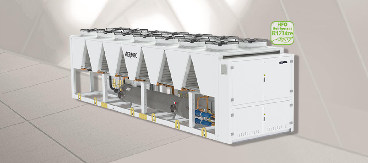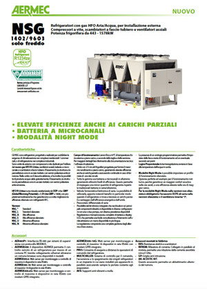 Aermec presenta la serie di refrigeratori d’acqua condensati ad aria NSG: elevati livelli di efficienza energetica grazie al refrigerante R1234ze.