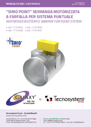 La serranda motorizzata a farfalla Sirio Point è progettata per la regolazione del flusso d’aria all’interno dei sistemi puntuali Galaxy. Il motore deve essere installato parallelo alla serranda interna in posizione di chiusura, con albero perpendicolare al disco della farfalla. La struttura integra contatti puliti per il controllo di altre utenze e consente collegamenti elettrici diretti tramite morsettiera del regolatore.